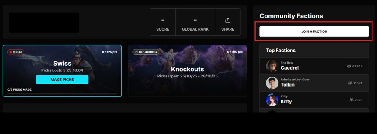 Bu il Pick’Ems Factions ilə daha epik oldu. Tələkəçilər sevimli yaradıcılarla birləşib rəqabət edə bilər. Turnir bitdikdə ən yüksək orta balı olan Faction hər üzvə unikal emoti açacaq – bu başqa yerdə yoxdur.