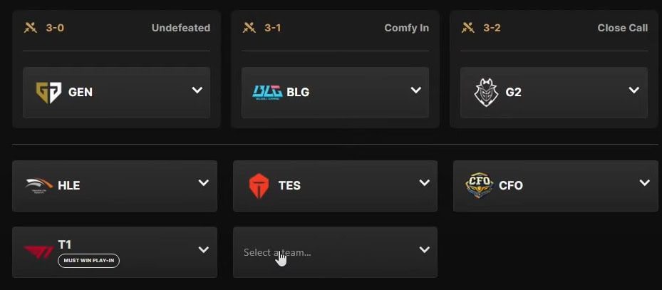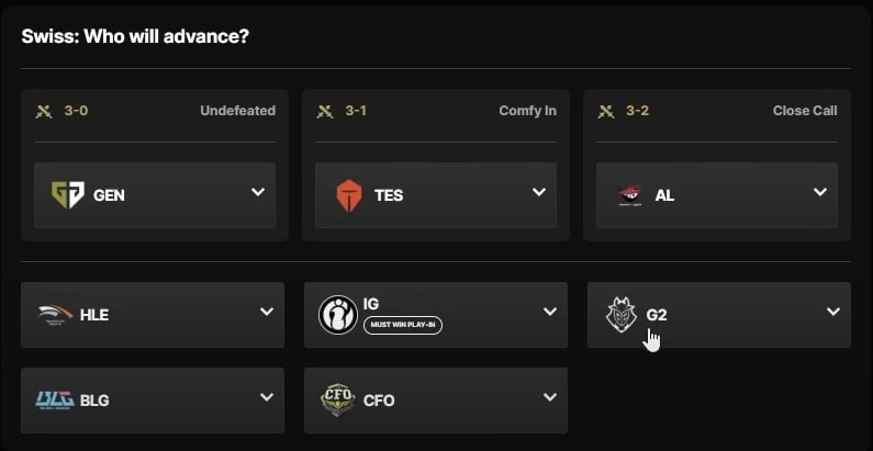 Pick’Ems seçimlərini oyun klientində və ya rəsmi veb-saytda edə bilərsiniz. “Başla” düyməsini klikləyin və təlimatları izləyin. Bu məqalə yalnız komanda nəticələrinə həsr olunub. Kristal Şar proqnozları ayrı məqalədə işlənəcək; tezliklə bağlantı əlavə olunacaq.