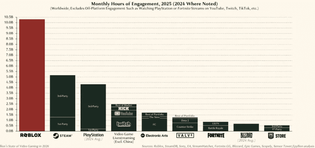 - Müqayisəli Üstünlük: Bu göstərici Steam, PlayStation və Fortnite-ın ümumi oyun saatlarının cəmindən daha çoxdur.