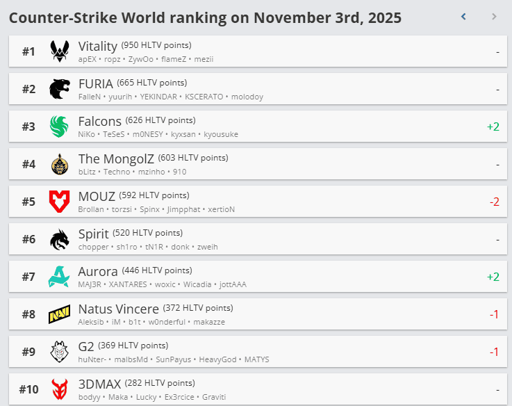 Team Vitality reytinqdə birinci yeri qoruyub saxlayıb, FURIA Esports isə ikinci pillədə qərarlaşıb. Team Falcons isə IEM Chengdu 2025 turnirindəki uğurlu startı və ESL Pro League Season 22-də qazandığı ikinci yer sayəsində ilk dəfə top-3-lüyə daxil olub. Komanda bununla The MongolZ və MOUZ-u arxada qoyub.